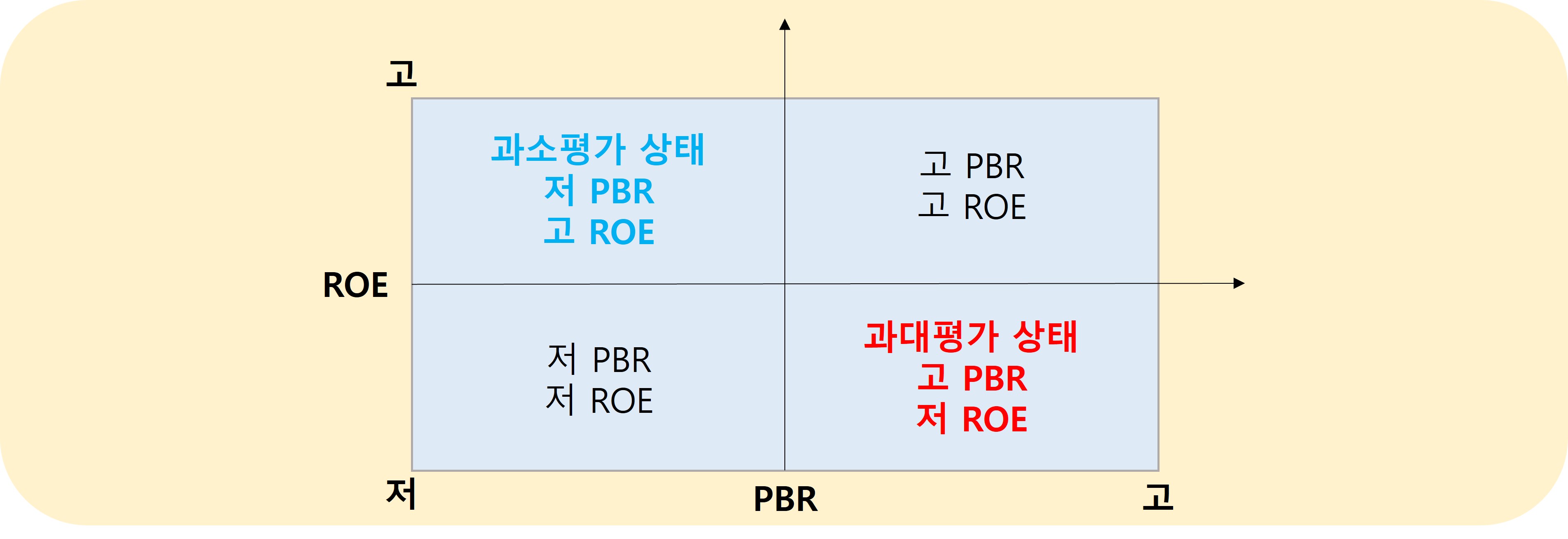 위 네 가지의 상태 중 고 PBR, 고 ROE상태와 저 PBR, 저 ROE 상태는 주가가 적정수준에 있다고 봐도 무방합니다. ROE가 낮은데도 불구하고 PBR이 높게 형성되어 있다면 자산가치에 비해 주가가 과대평가 되어있다는 뜻입니다. 반대로 ROE는 높은데 PBR이 낮은 경우 실제 회사 자산가치에 비해 주가가 저평가되어 있다는 뜻이므로 투자를 고려해볼만한 기업이라고 할 수 있습니다.